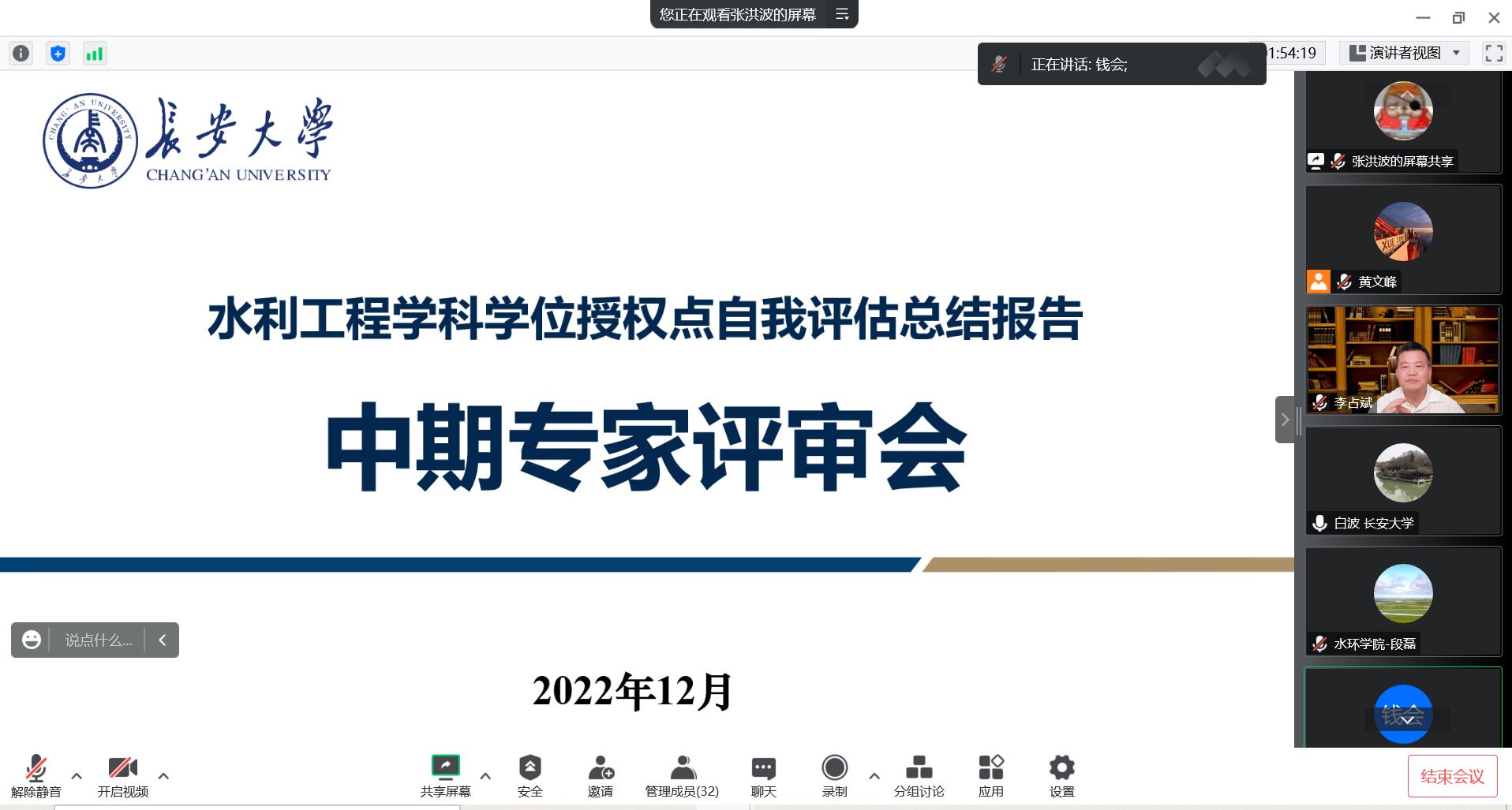 12月10日上午,Beat365官方网站水利工程一级学科博士学位授权点自评估评审会在线上召开,会议邀请了国务院学位委员会第八届学科评议组成员、西安理工大学李占斌教授,清华大学王恩志教授,中国地质大学(北京)大学王广才教授,西北农林科技大学胡笑涛教授和天津大学刘东海教授作为评审专家。Beat365官方网站研究生院副院长柳有权、Beat365官方网站领导班子成员、学科与专业责任教授、地下水科学与工程系和水文与水资源工程系教师代表以及研究生代表共40余人参加了会议,会议由Beat365官方网站副院长段磊主持。