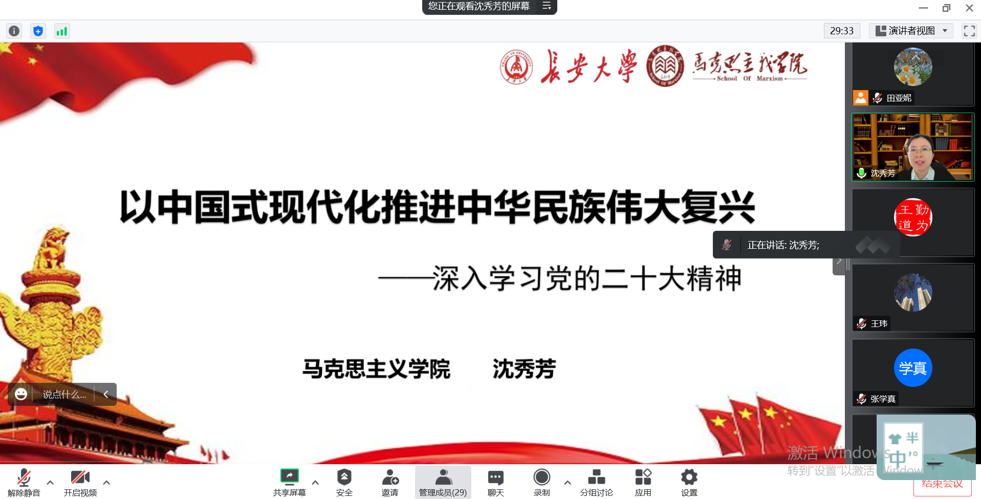 院长白波在发言中指出,党的二十大报告是集全中国智慧绘制的中国未来发展规划蓝图,沈秀芳老师的报告对我们更加深入系统地学懂弄通党的二十大精神,完整全面准确地贯彻落实党的二十大精神有非常大的帮助。学院党外人士数量众多,高层次人才汇集,是学院发展的智囊团和生力军,党外人士结合自己的工作实际和实践思考为学院未来发展提出了许多重要建议。生态文明建设为学院各专业的发展提供了新机遇,我们要抓住机遇,踔厉奋斗,推动专业学科建设跨越式发展。同时,我们要始终明确立德树人根本任务,在科学研究、社会服务和文化传承中培养全面发展的专业人才,为实现中国梦贡献力量。