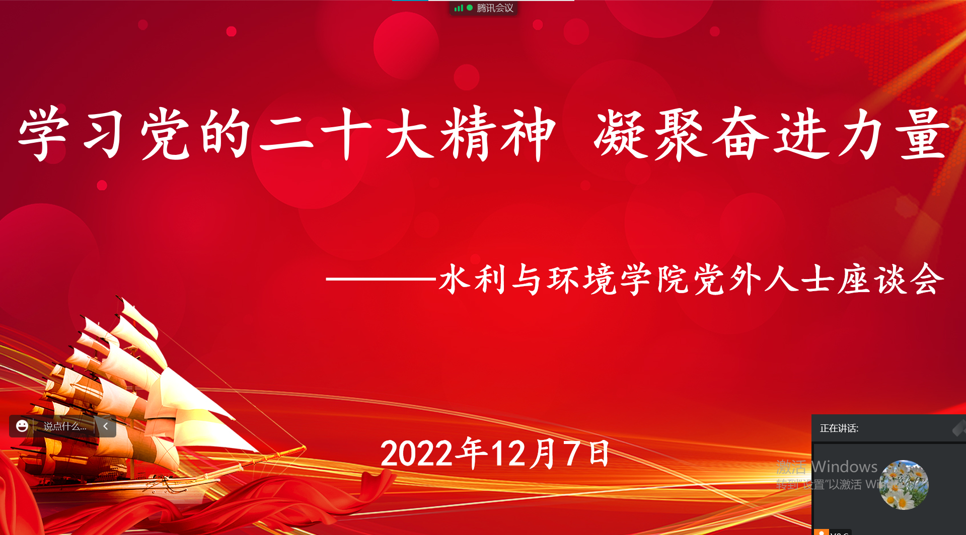 学院党委书记邓红章做总结发言,对学院党外人士为推动学院各项事业发展做出的贡献表示感谢,并提出四点希望:一是深入学习宣传贯彻党的二十大精神,切实把思想、行动统一到党的二十大精神上来,把智慧和力量凝聚到落实党的二十大确定的目标任务上来;二是不断加强民主党派自身建设,准确把握新时代统一战线的政治方向和使命任务,提升运用统战思维解决问题的能力;三是主动担当作为,聚焦中共中央决策部署和学校学院重点工作,充分发挥自身优势,继续发挥参政议政、建言献策、民主监督的作用;四是希望党外人士和无党派人士积极参加党组织的各项活动,进一步了解中国共产党,向党组织靠拢。