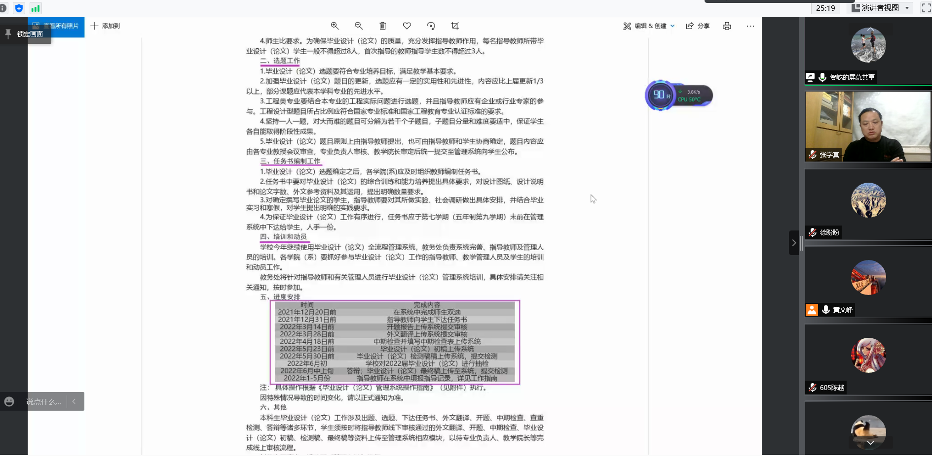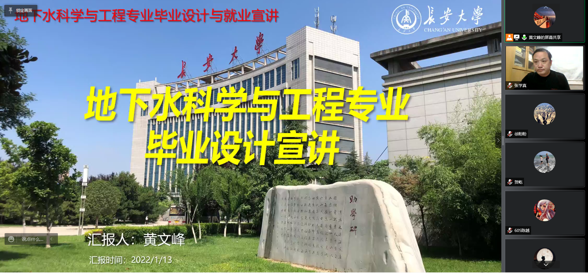 2022年1月13日晚,地下水科学与工程系在线上召开了2022届本科毕业设计(论文)宣讲会,参会人员有系主任黄文峰、副主任贺屹和郑涵、毕业设计指导教师代表张学真、新进教师及全体2022届地下水专业本科生,会议由黄文峰主持。