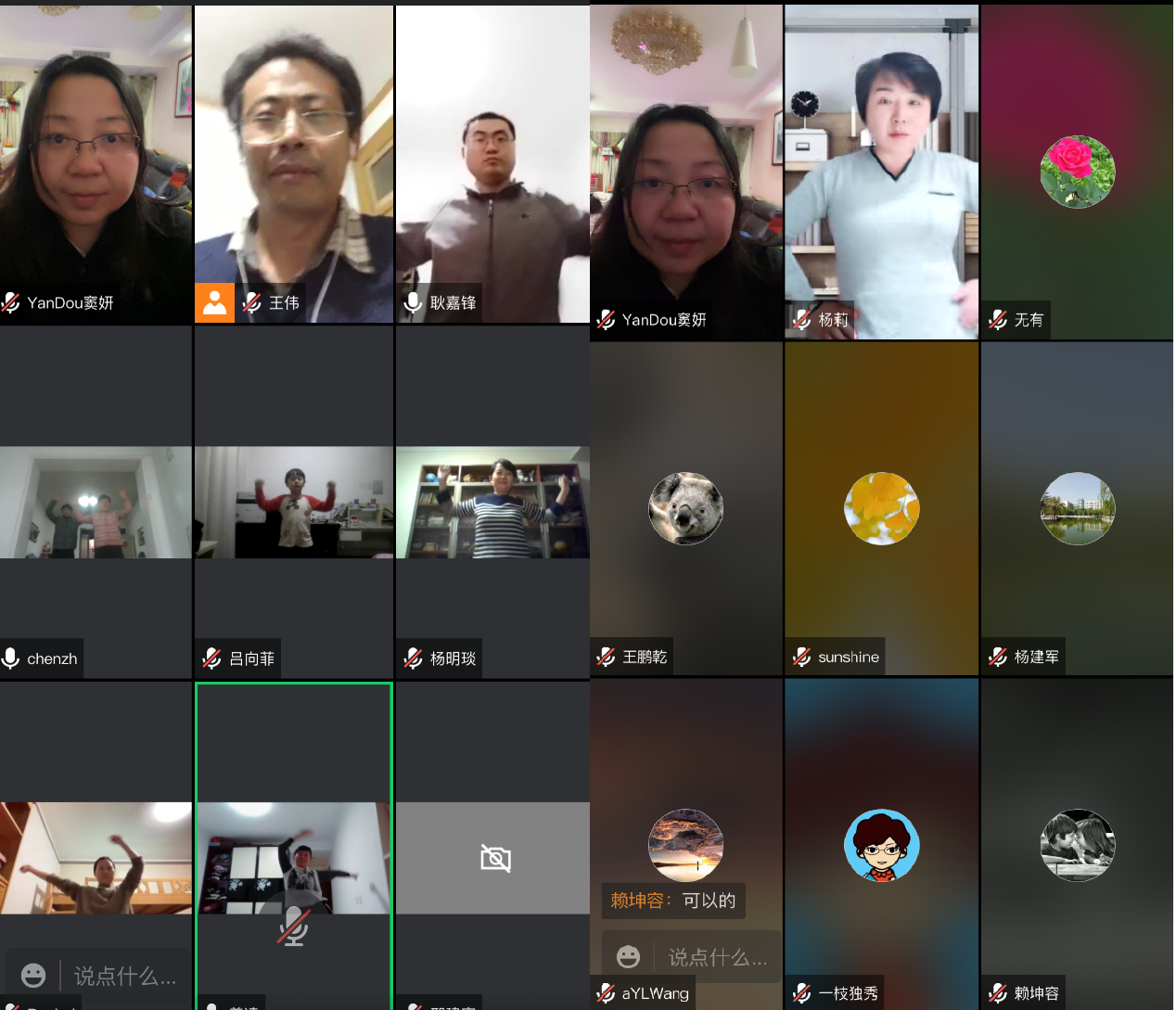 联欢会上,教师们自发组织了成语接龙、飞花令、歌曲展演等庆祝形式,化工系杨建军老师作为渭水家属区疫情工作小组的成员,分享了抗议期间的工作感悟及疫情防控小知识。虽然大家在“云端”,但是整个联欢会既有欢歌笑语,又有感动瞬间。最后,新年联欢会在一场“云端”健身操的气氛中圆满结束。