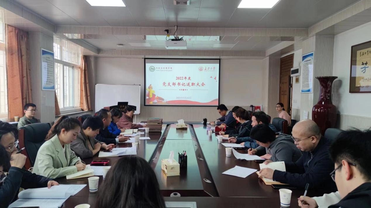 为深入学习贯彻习近平新时代中国特色社会主义思想、党的二十大精神,落实各级党组织关于加强基层支部建设的工作要求和重点任务,推动全面从严治党向基层党支部延伸,3月31日,学院党委组织召开了2022年度基层党支部书记工作述职评议会,学院党委书记邓红章、副书记兼副院长马明芳、副书记王妍、部分党委委员、各师生党支部书记参加会议,会议由马明芳主持。