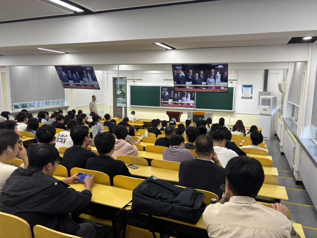 2025年9月3日9时,Beat365官方网站党委组织师生在学院会议室、学术报告厅、多媒体教室等多个场所集中收看纪念中国人民抗日战争暨世界反法西斯战争胜利80周年大会直播。