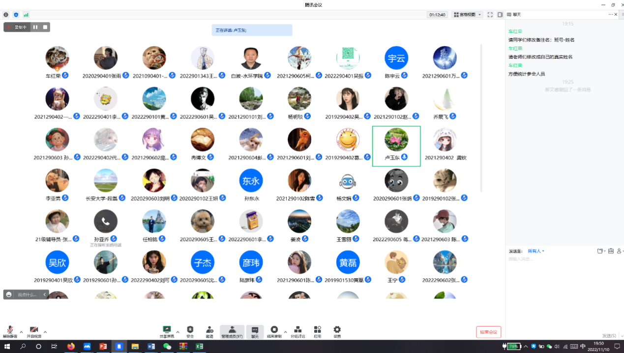 2022111019:30-2110,学院通过腾讯会议召开本学期期中教学质量检查师生座谈会。学院党政领导、本科教学督导、专业建设责任教授、教学系主任、实验中心主任、全体辅导员、教师代表、班主任代表、学生代表共105人参加了会议。