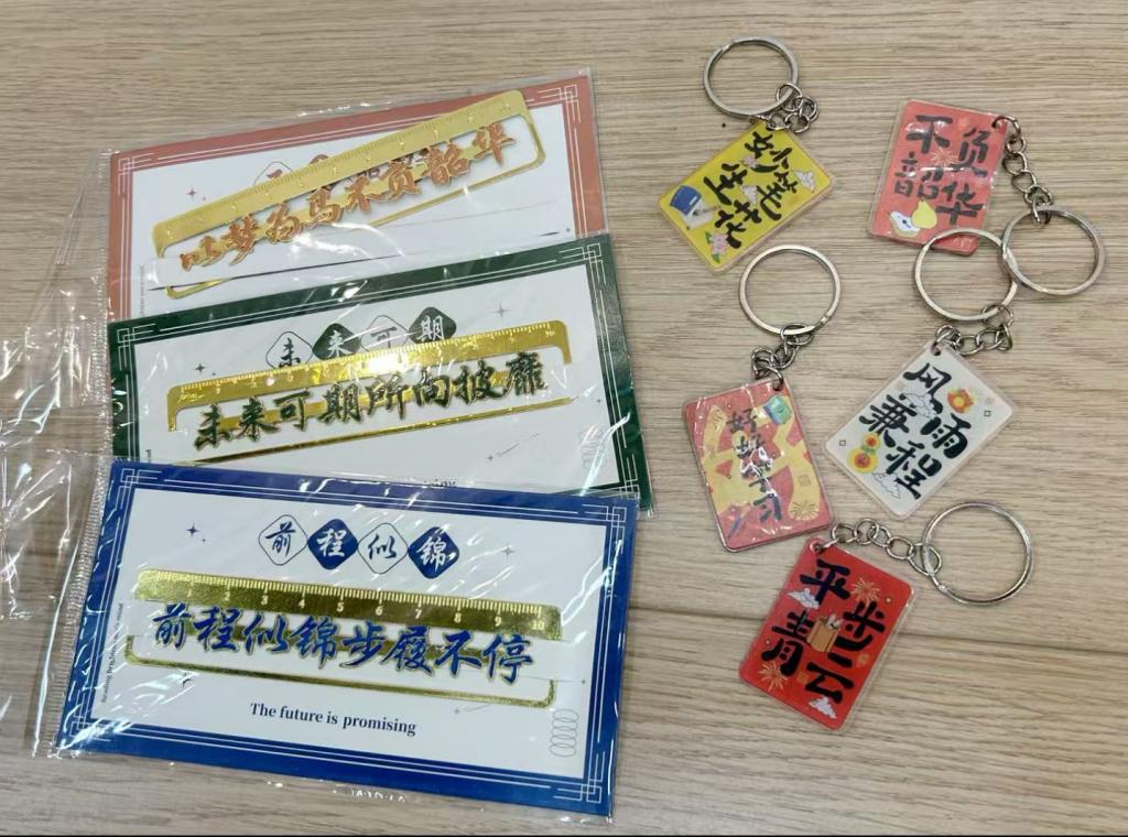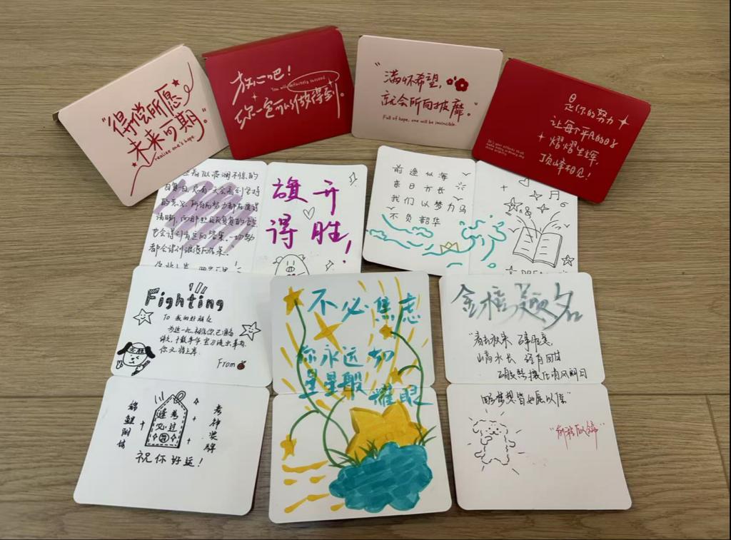为助力考研学子全力冲刺、圆梦考场,学院精心筹备的"考研加油包"满载温情。礼包中包含学院领导班子、系室主任、教工党支部书记、辅导员及学弟学妹们亲手书写的祝福贺卡;“天道酬勤”励志书签,以隽永文字时刻勉励追梦人;甜蜜糖果,将“金榜题名”的美好祝福融进舌尖;舒缓眼贴,为疲惫的眼眸送上片刻放松;还有刻着“前程似锦”字样的定制钥匙扣,寓意开启通往理想学府的大门。从精神慰藉到实用助力,这份礼包全方位为考研学子保驾护航。